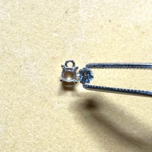 この台座は、この宝石にぴたりと合うために業者さまに仕立てていただいたので、この台座(石座といわれます)のみsilver925製です。どれくらいの大きさかというと、宝石の大きさが4mm(おおよそ0.2ct超です)です。その宝石を石座の上に乗せるだけでは留まらないため、四方の柱のように見える「爪」を内側にそっと押し曲げて、宝石を包んで留めます。