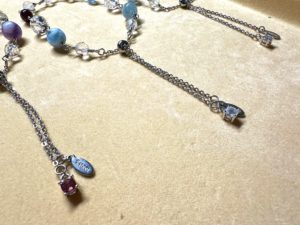 ここでアジャスター(ブレスレットの長さ調節のためのゆとりをもたせた部位)の先に、天然石の中でも一番質のよい、いわゆる「宝石」と呼ばれる石をチャーム(飾り)としてつけることにしました。